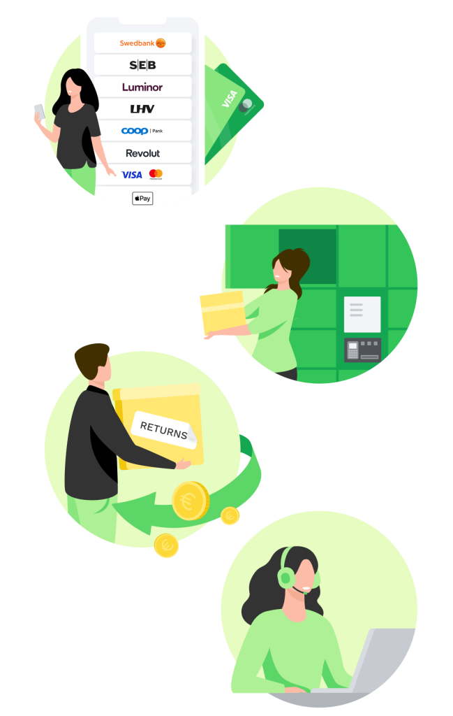 Parcel machines are by far the most popular way to receive e-commerce purchases. We make it easy for merchants to register purchases with delivery companies like Omniva, DPD, SmartPosti and LP Express. Refer to payments and delivery service page for detailed information.