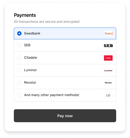 Offer your customers the most trusted local and international payment methods – all integrated natively into Shopify. We actively expand our payment options to ensure the best coverage across the Baltics and Europe.